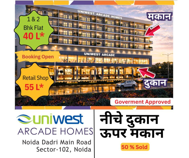 Uniwest Arcade Home is a premium residential project located in Sector 102, Central Noida, offering modern living at an attractive price. The project features well-planned 1 BHK and 2 BHK apartments, designed for comfort, convenience, and smart space utilization.\\r\\nWith an easy 30:70 payment plan (30% on booking and 70% on possession), Uniwest Arcade Home is ideal for both end-users and investors. The project offers 4 high-speed lifts per floor, excellent connectivity, and is just 800 meters from the nearest metro station.\\r\\nStrategically located, it is 10 minutes from Sector 18, 5 minutes from Noida Golf Course, and 2 minutes from Sector 104, ensuring quick access to key business and lifestyle hubs